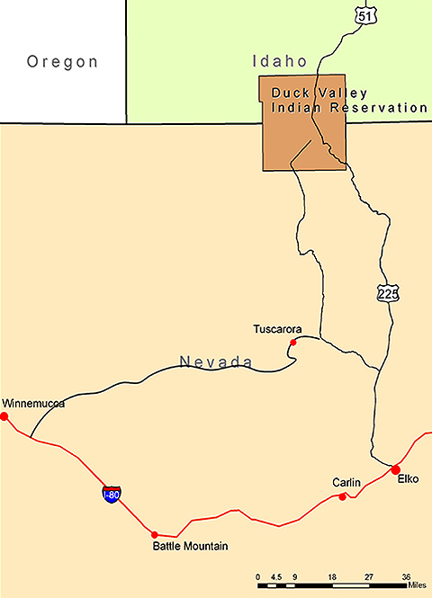 Take exit 301 in Elko, NV - if you're coming from Reno take a left on Mtn. City/NV-225 and if you're coming from Wendover, NV take a right on Mtn. City/NV-225. Follow NV-225 for 96 miles to reach the Duck Valley Indian Reservation